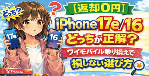 NEW! ワイモバイル 【返却0円】iPhone 17e/16どっちが正解?ワイモバイル乗り換えで損しない選び方 2026年3月11日 「同じ月額402円なら、iPhone 17eと16どっちが良いの?」と迷っている方必見!2機種の違いをカメラや容量など迷うポイントだけに絞ってやさしく比較。さらに、他社にはないワイモバイル限定の「返却費用0円」で、2年総額を最も安く抑えるオンライン申込の手順も公開します。...