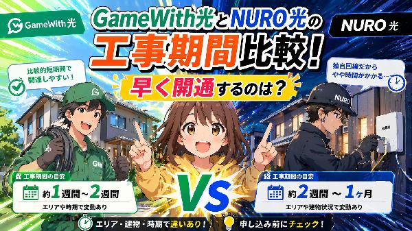 Gamewith光 GameWith光とNURO光の工事期間比較!早く開通するのは? 2026年4月14日 ゲーミング回線を引いてFPSを快適にプレイしたいけれど、「開通まで何ヶ月も待たされるのは絶対に嫌だ」と悩んでいませんか? ゲーム特化回線として大人気の「GameWith光」と「NURO光」。いざ申し込むとなると、結局どちらが早く、手間なく開通できるのか白黒はっきりさせたいですよね。 ネット上には「NURO光は工事が遅す...
