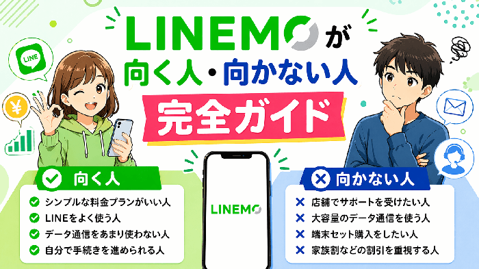 LINEMO 【LINEギガフリー】LINEMOが向く人・向かない人完全ガイド 2026年4月16日 LINEMOはどんな人に向いてる?月990円〜でLINEギガフリー&ソフトバンク回線。ライトユーザー・LINEヘビーユーザー・オンライン手続きOKな人に最適。店舗不要・家族割なしなど向かない人も解説【2026年4月最新】...