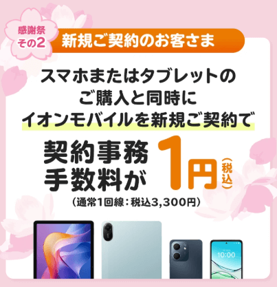 感謝祭その2 スマホまたはタブレットの購入と同時にイオンモバイルを新規ご契約で、事務手数料が1円(通常3,300円)。※お乗換え(MNP)でのご契約/エントリーパッケージのご購入/法人のお客さまのご契約はいずれも対象外