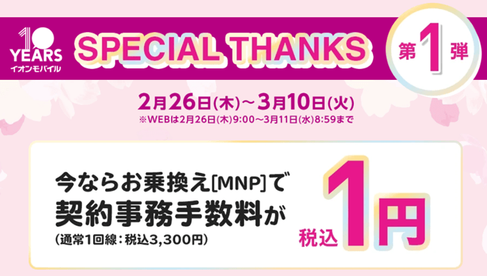 乗り換えで【MNP】で契約事務手数料が1円! ◆対象期間 店舗 2026年2月26日(木)~ 2026年3月10日(火) イオンモバイルでは、契約事務手数料(SIMカード代金)が通常3300円のところ、他社から乗り換え(MNP)で1円のキャンペーンを開催中です。 ※音声SIM、シェア音声SIM1回線目は、紹介コード(千円分のWAON特典)が併用できます。