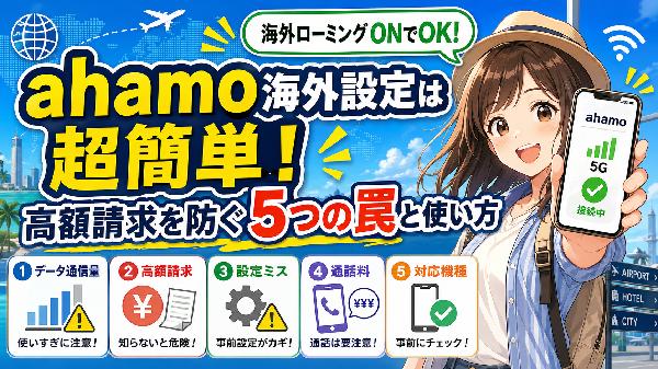 データローミングとは、日本のスマホが海外の現地キャリアの電波を「借りる」ためのスイッチです。普段はオフになっていることがほとんどなので、意識的に切り替えてあげる必要があります。ahamoなら30GBまで追加料金なしで使えるので、ためらわずにオンにしてください。出発ゲートで搭乗を待ちながら、コーヒー片手に数秒で終わる作業です。