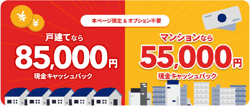 - 2025年12月15日から特典増額!戸建て8.5万円、マンション5.5万円の基本キャッシュバック。