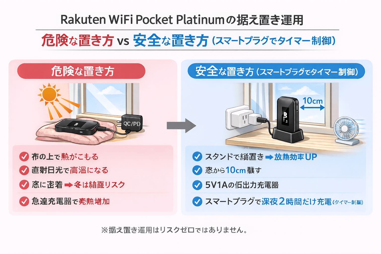 発熱管理・満充電の回避・設置環境の最適化を行えば、Rakuten WiFi Pocket Platinumを自宅で安全に据え置き運用できます。スマートプラグと低出力充電器を活用し、バッテリーを長持ちさせながら快適に使いましょう。