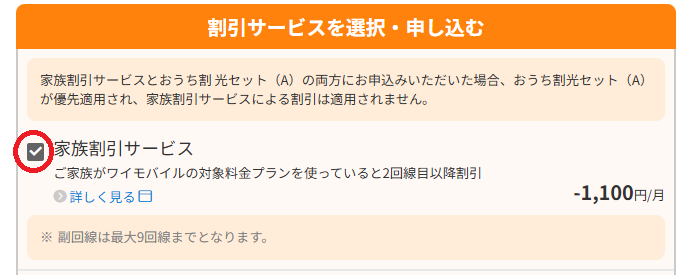 - 重要: 申し込み画面で必ず「家族割引サービス」を選択する。
